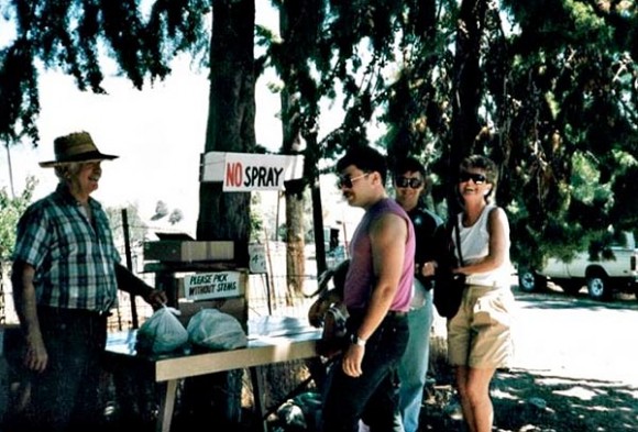 This is a photo of Levitt (left) operating his “pick-your-own” orchard in later years: