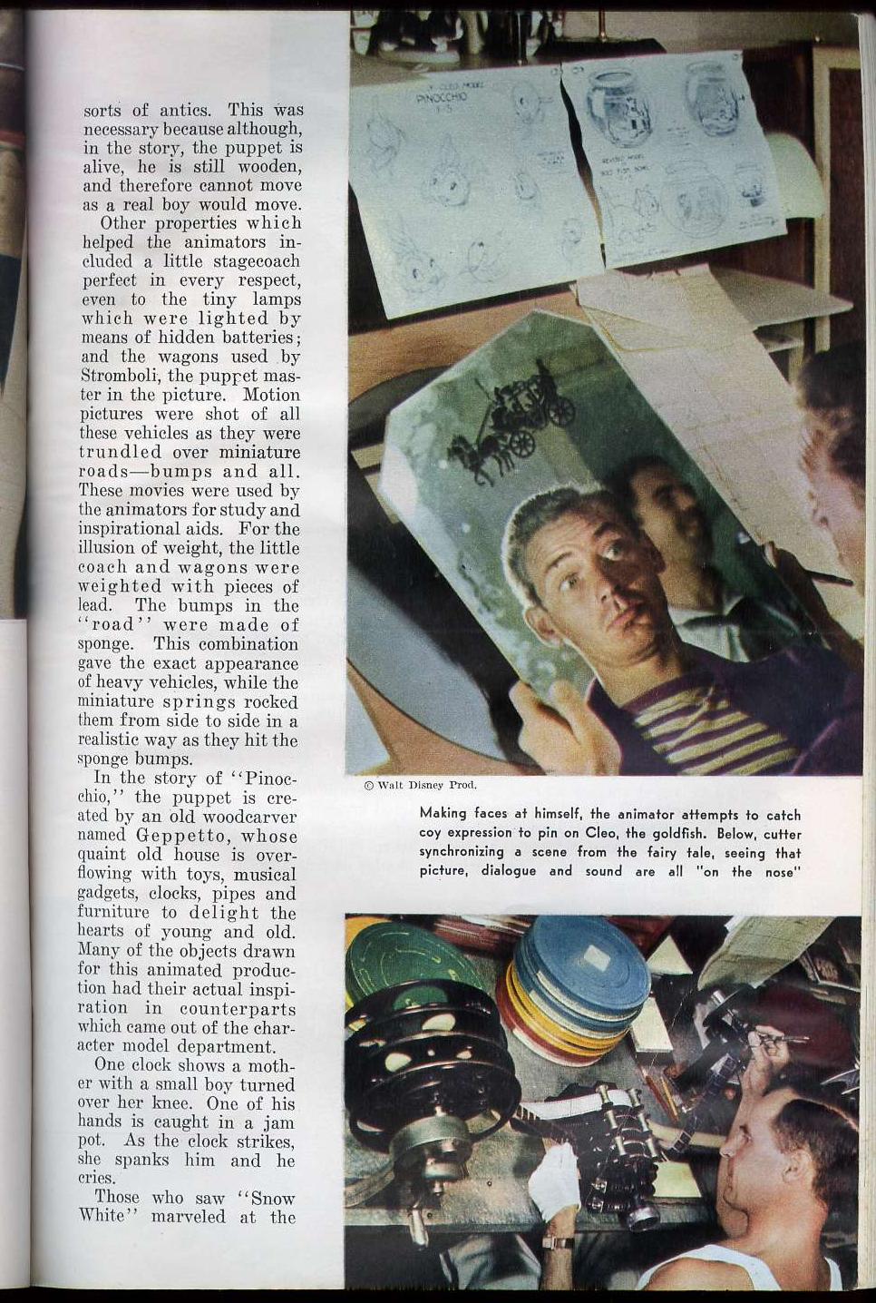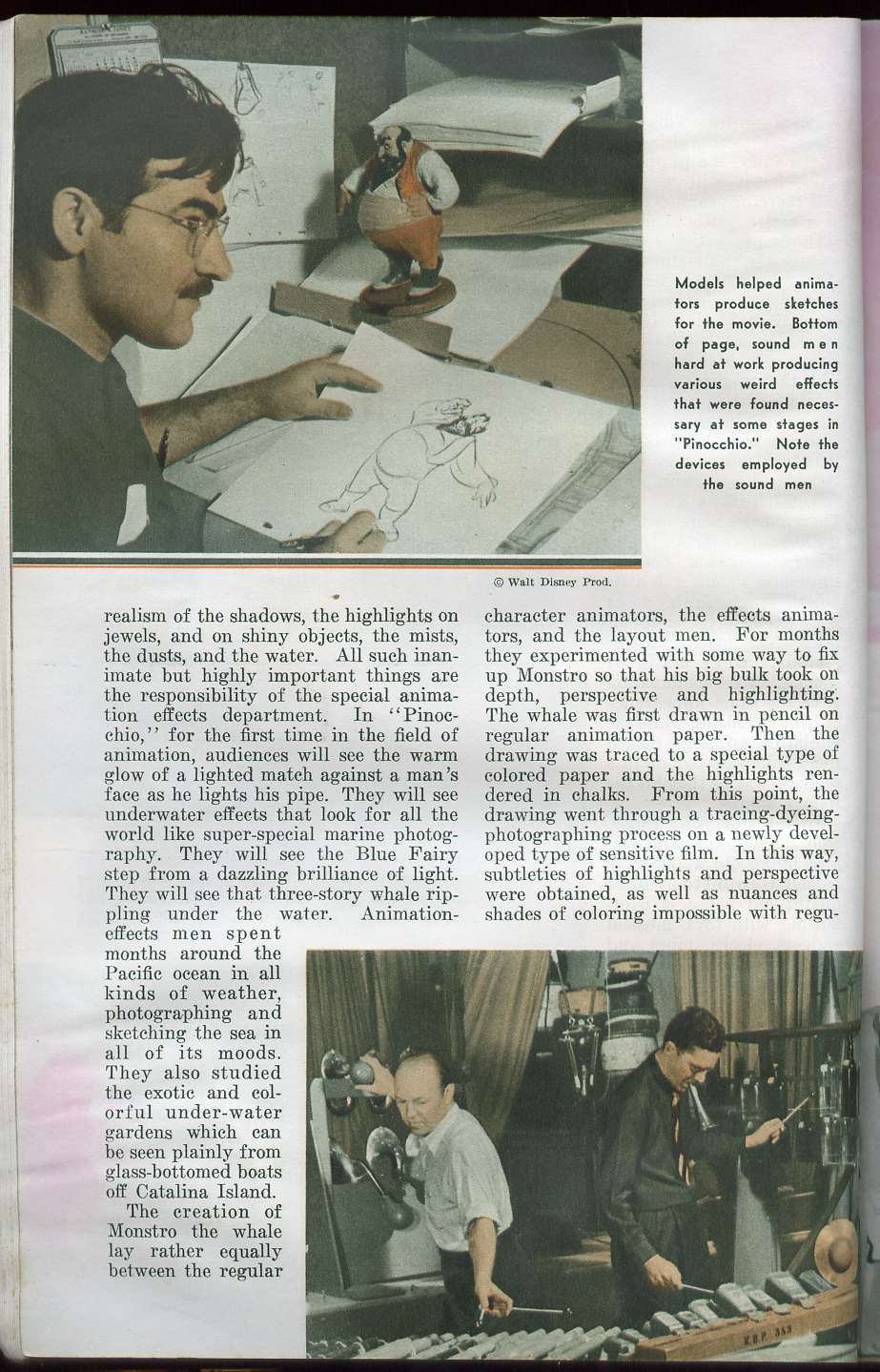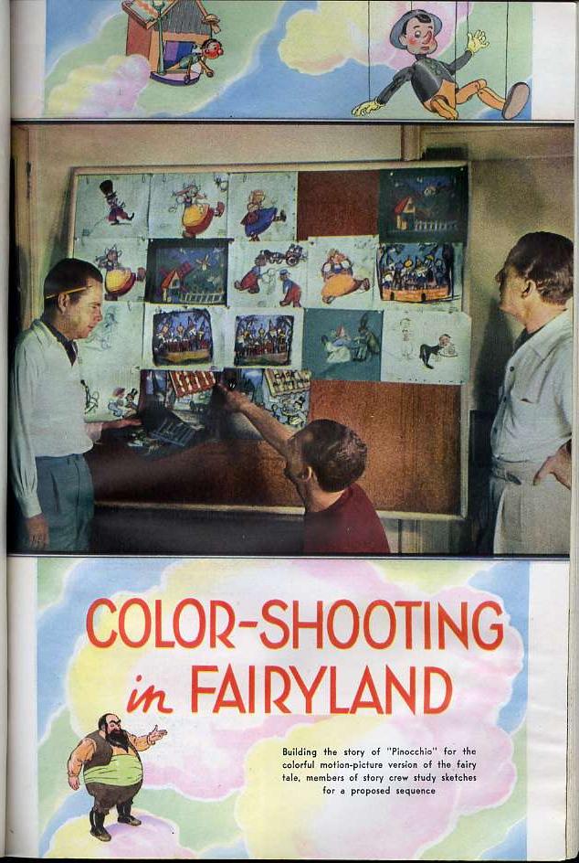 It’s also interesting to note that not a single artist is identified in the photo captions or article. The only person named is Walt Disney. I’ll try to right that wrong by identifying a few of the individuals. The story artists on the title page are (left to right) Ted Sears, Otto Englander and Webb Smith. The animator at top of page 6 is, of course, Bill Tytla, and the woman painting the model of Pinocchio on page 7 is Helen Nerbovig (who also happened to be the wife of background painter Bob McIntosh). If you can identify other people, let me know.