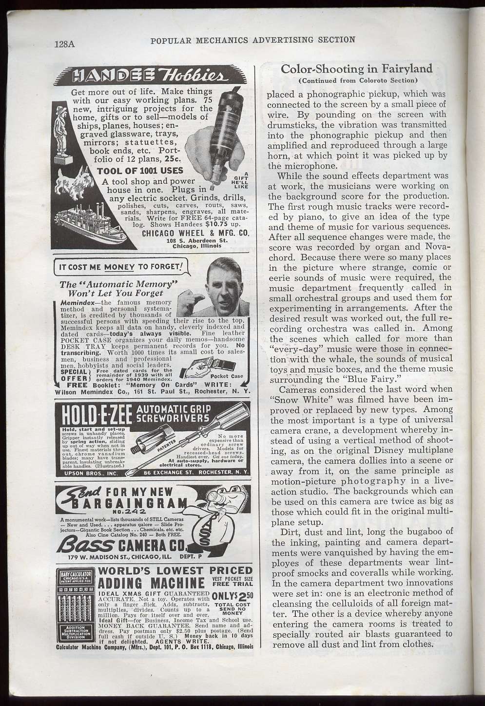 Brew reader Chris Olson found an old issue of POPULAR MECHANICS with a behind-the-scenes look at the making of PINOCCHIO, and he was kind enough to make scans of the article for other Brew readers to see. The PM issue (volume 1, no. 73) was released in January 1940, a month before the film was released. The article emphasizes the technical aspects of the production, and includes some bizarre and incredible photos, such as the “mad scientist”-looking sound fx guys above. Other photos show people mixing cel paint dyes, toying around with electrical equipment, painting puppets and doing all types of things that one doesn’t typically associate with an animated production.
