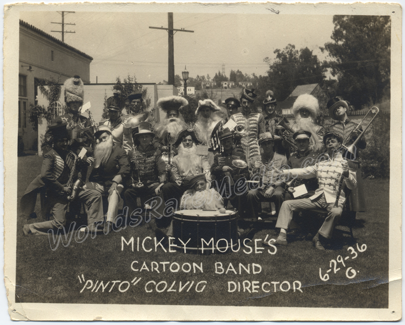 Long before the Firehouse Five Plus Two (not to mention Sgt. Pepper’s Lonely Hearts Club Band), Pinto Colvig (storyman, voice of Goofy) apparently organized a Disney Studio in-house “Cartoon Band”. I know nothing about the story behind this June 29th, 1936 mystery photo (click to enlarge) beyond the clues in the picture itself: It’s on the Hyperion street lot; there’s Ward Kimball on the far right with the trombone; and is that Pinto with the white beard, center, behind the drummer? And heck, is that Walt center right, standing with the trumpet, fourth from the right?