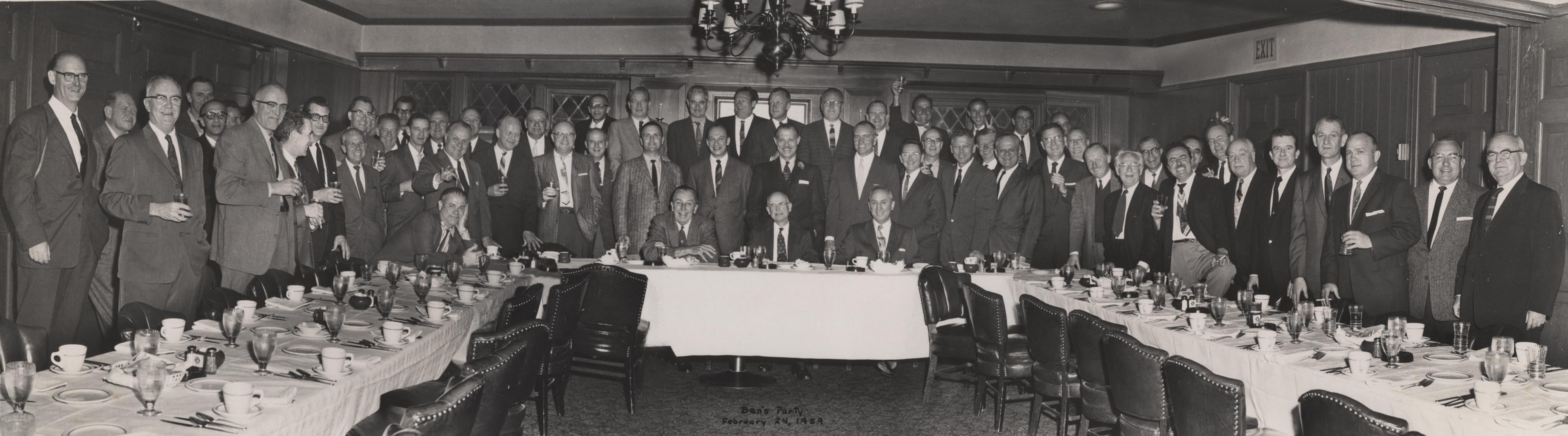 If you’re a fan of conservatively dressed middle-aged white men, boy, do I have a treat for you today. This photo from February 24, 1959, was taken on the occasion of Ben Sharpsteen’s retirement from Disney. Sharpsteen, who is flanked by Walt and Roy, was the supervising director of Pinocchio and Dumbo, as well as Walt’s most frequently whipped “whipping boy,” among many other roles during a thirty-year career at the studio. Pretty much anybody who was a somebody at Disney showed up for his retirement soiree. It is an inspiring image from Hollywood’s Golden Age, and alternately, a sad commentary on how little diversity existed in the upper ranks of the Walt Disney Company during this period.