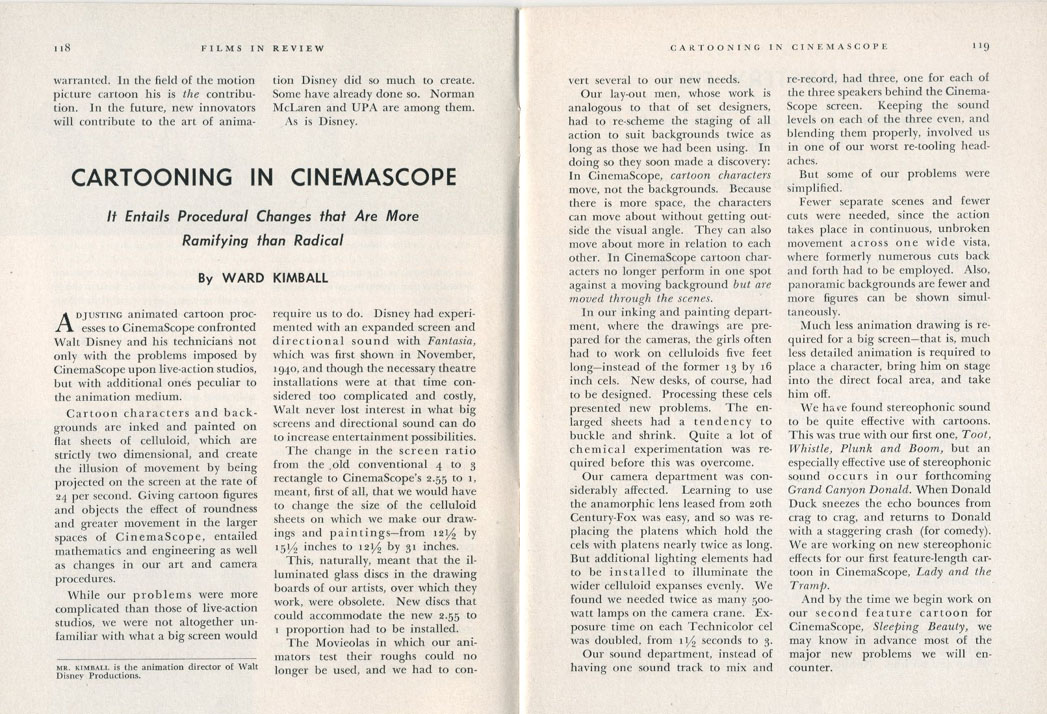 Several years ago I curated a program of CinemaScope cartoon shorts from the 1950s, which I screened at the Ottawa Animation Festival, the Museum of Modern Art and several other venues. While researching the subject, I came upon a small article by Ward Kimball, from Films In Review (March 1954), in which he discusses the subject.