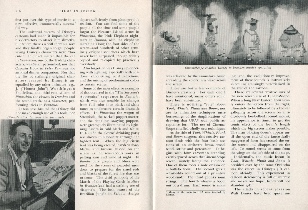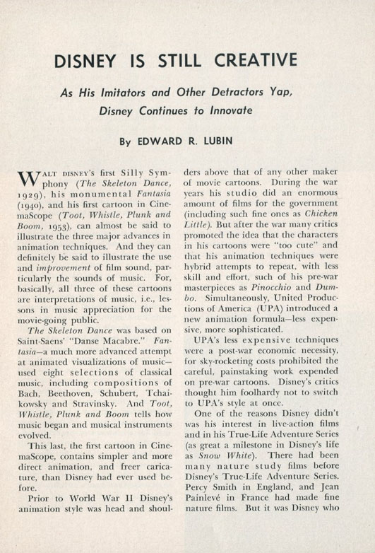 Kimball’s piece is preceeded by an overview by writer Ed Lubin entitled “Disney Is Still Creative”(!) which touts the studio’s relevancy during the changing animation scene of the early 50s. Click on the thumbnails below to read both articles.