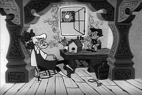 Other highlights on the disc include a rare reel of the Soundac TV Weatherman shorts and a Shamus Culhane commercial sample reel. I hate to admit it, but Steve located a much better copy of UPA’s Magic Fluke than the one that appears on the Jolly Frolics set (it’s from a rare 35mm Technicolor print but contains a few splices). UPA’s industrial Big Tim, from a beautiful 35mm IB tech nitrate print, and John Sutherland’s Oreb/Haboush design masterpiece Destination Earth, transferred from a mint 16mm IB, are here. There’s much much more – shorts and oddities, like Grantray Lawrence’s lost pilot Planet Patrol, a rare workprint of a Paramount Popeye cartoon, and Zagreb’s The Cow On The Moon (1959).