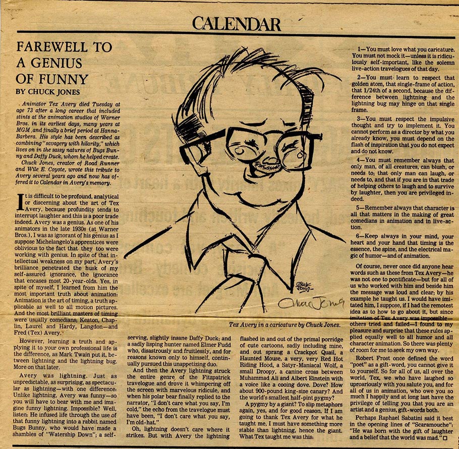 In this 1980 tribute to legendary animation director Tex Avery, fellow legendary director Chuck Jones shared six lessons that he learned about comedy from working with Avery in the 1930s. The advice remains essential to any animation director working today: