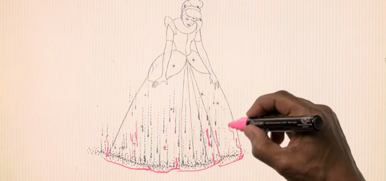The scene in question is Cinderella’s dress transformation, when the Fairy Godmother turns her torn pink garment into a resplendent ballgown. West identifies this as an example of “character effects… a moment where effects and character animation are interlinked.” He explains how Marc Davis’s character animation and George Rowley’s effects work complement one another, enhancing the magical elements of the story.