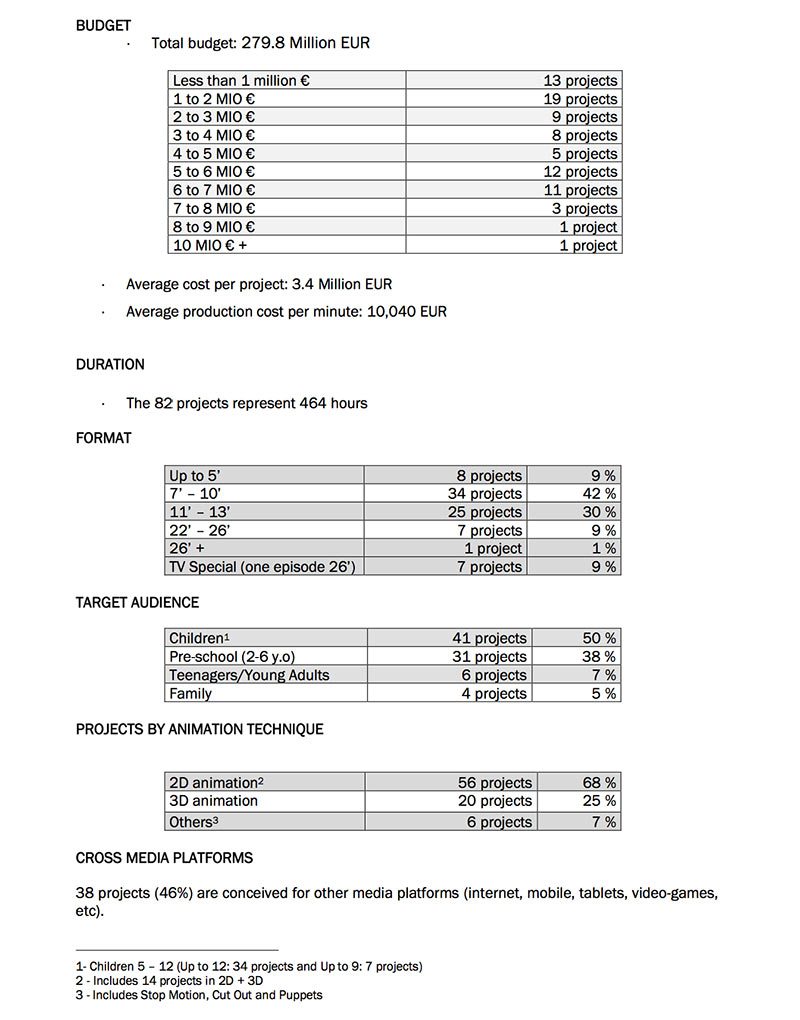 This year, 82 projects were pitched at Cartoon Forum, totalling 279.8 million euros in budget and 464 hours of programming. The average budget for each project was 3.4 million euros, with half of the projects aimed at children 5-12 years old.