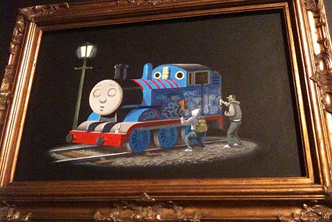 Graffiti/street art has a complicated relationship with animation, which is a thread that the curators of the exhibit never explore. While the show features a handful of artists, like the aforementioned Rammellzee, who have the ability to express personal ideas beyond the confines of referential pop culture, many of the artists from Kenny Scharf to Banksy to the anonymous graffiti writers who painted on the sides of subway cars have relied on animated characters as their lingua franca for communicating with the general public. These cartoon characters, to my surprise, are rarely used to make any statement or to subvert the original intentions of the characters, a la Wally Wood’s infamous Disney “orgy” drawing. For graffiti and street artists, the act of recreating popular cartoon iconography is considered an accomplishment in and of itself.