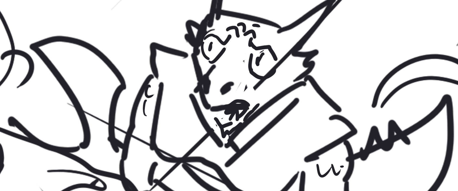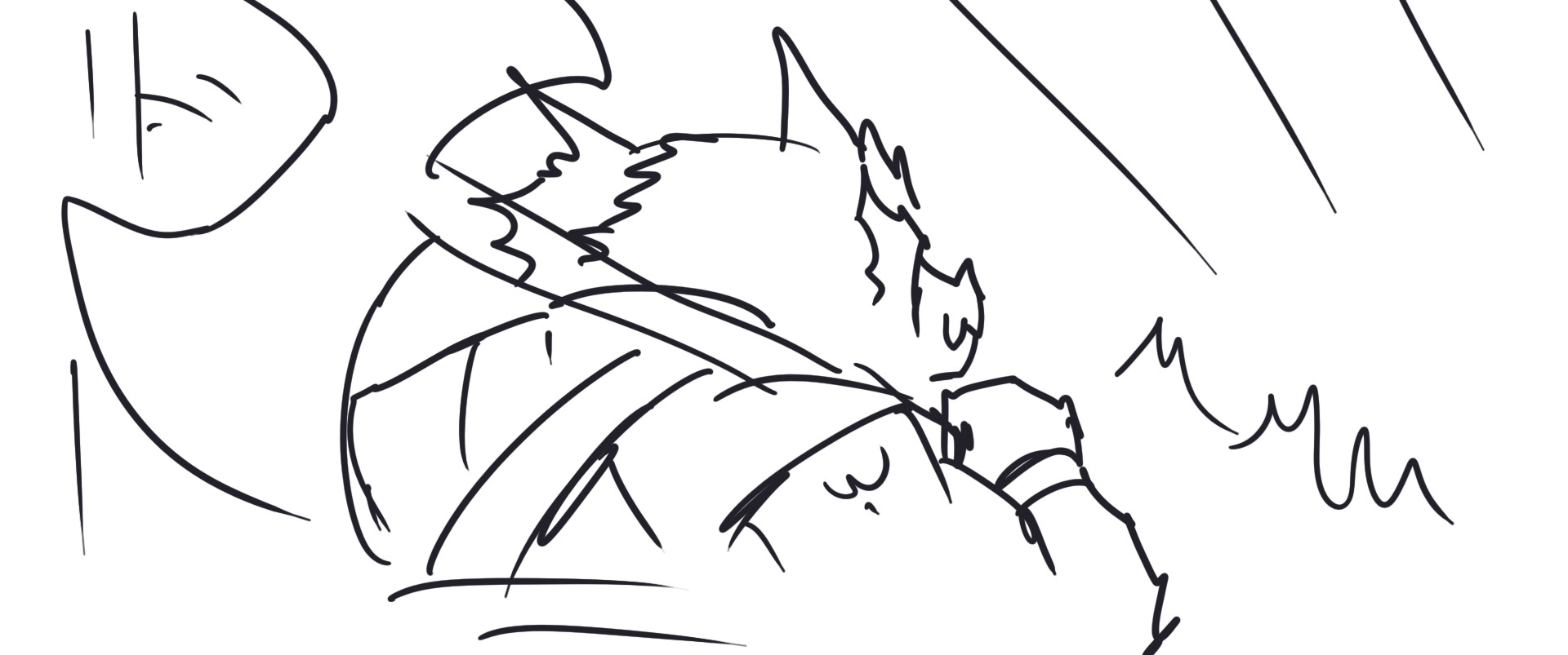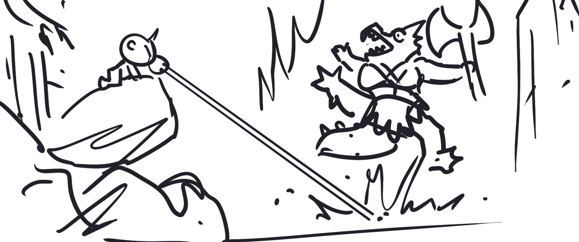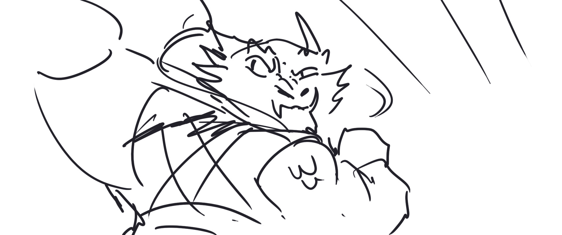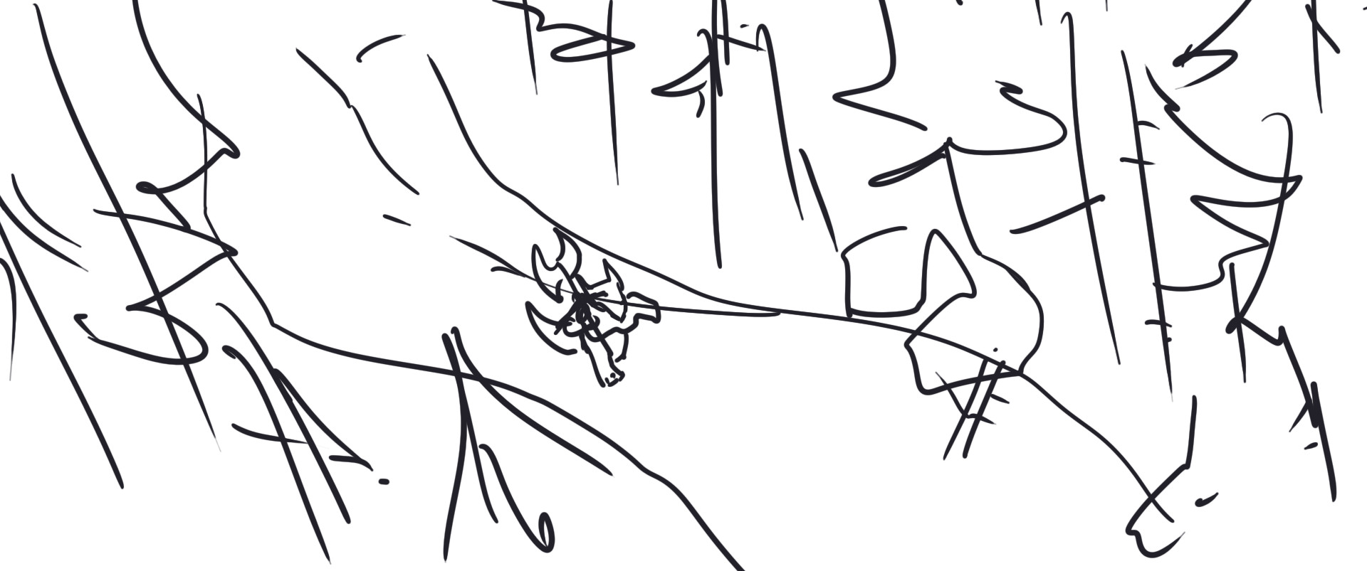He began sketching an opening scene on the screen — a wide shot of a volcano leading down to a forest trail where the dragon-woman trudges along with an axe on her shoulder.