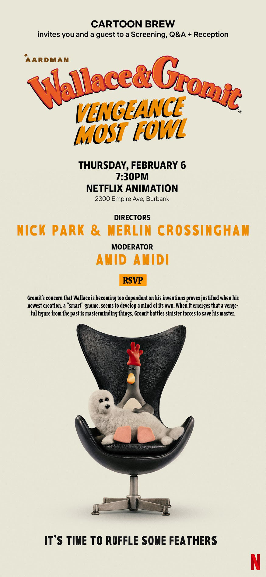 Cartoon Brew is pleased to invite you to a special screening of Netflix Animation and Aardman Animation’s new Oscar and BAFTA-nominated feature Wallace & Gromit: Vengeance Most Fowl, followed by a Q&A with directors Nick Park and Merlin Crossingham, hosted by Cartoon Brew editor-in-chief Amid Amidi. A reception with refreshments will follow the event.