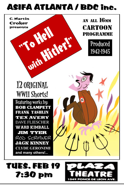 Next Tuesday, 2/19, at 7:30 p.m., ASIFA Atlanta is putting on To Hell with Hitler, a program of WW2-era cartoons at the Plaza Theatre ($4 members admission; $7 non-members).