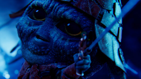 Pawny’s fighting abilities were an important part of the character, so Imageworks did some tests where he uses his sword to mock-fight and his blasters to fight off other aliens. “There was also his grappling guns that he uses in the Paris portal room scene at the end of the film,” added McPherson. “We had done some initial testing where he would jump around with those, and that would have been quite a fun thing to explore, but ultimately that didn’t make it in the movie.”