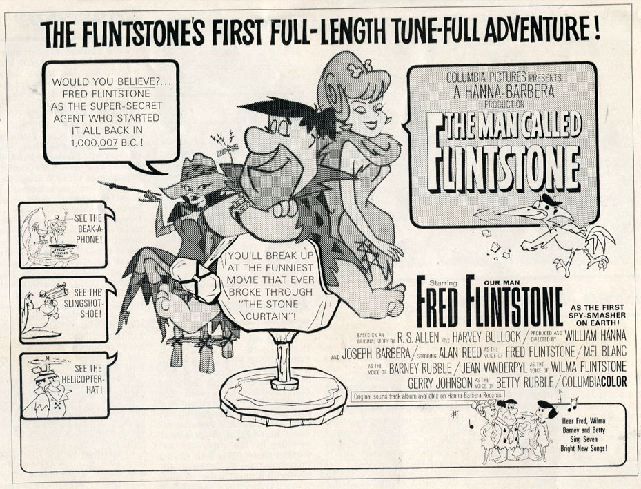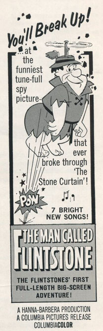 Not The Flinstones finest hour (or more precisely, an hour and twenty-seven minutes), but I thought we’d take a moment to acknowledge the 45th anniversary of the Hanna Barbera feature film, The Man Called Flintstone. I gathered together some material (including several rarely seen newspaper ads, below) to remind us of how the original prime time series (and feature) were initially aimed at adult audiences – so perhaps Seth MacFarlane’s forthcoming revamp won’t be so far off, after all. Or so we would hope.