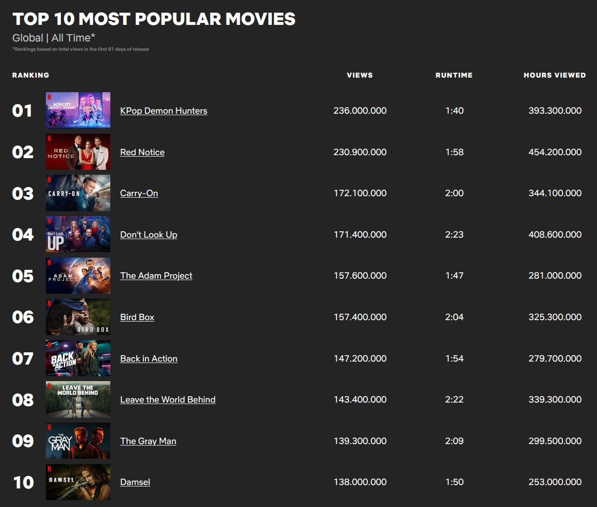 The film, which premiered June 20, racked up another 25.4 million views between August 18–24, pushing its lifetime total to 236 million. That tally edges out 2021’s Red Notice (230 million in its first 91 days) to take the top spot on Netflix’s all-time English-language films list.
