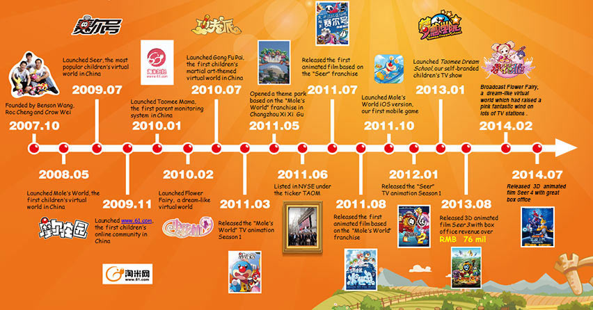 Directed by Zhang Jun Wang, Seer 5 is the fifth feature about a group of “space energy robots” who have intergalactic adventures while encouraging children’s interest in science and environmental protection. Taomee, the company that made the film, creates children’s animated franchises by launching them first as online games and virtual worlds, and then adapting them to traditional media like feature film and television. Here is a timeline from their website showing key highlights of the company’s history: