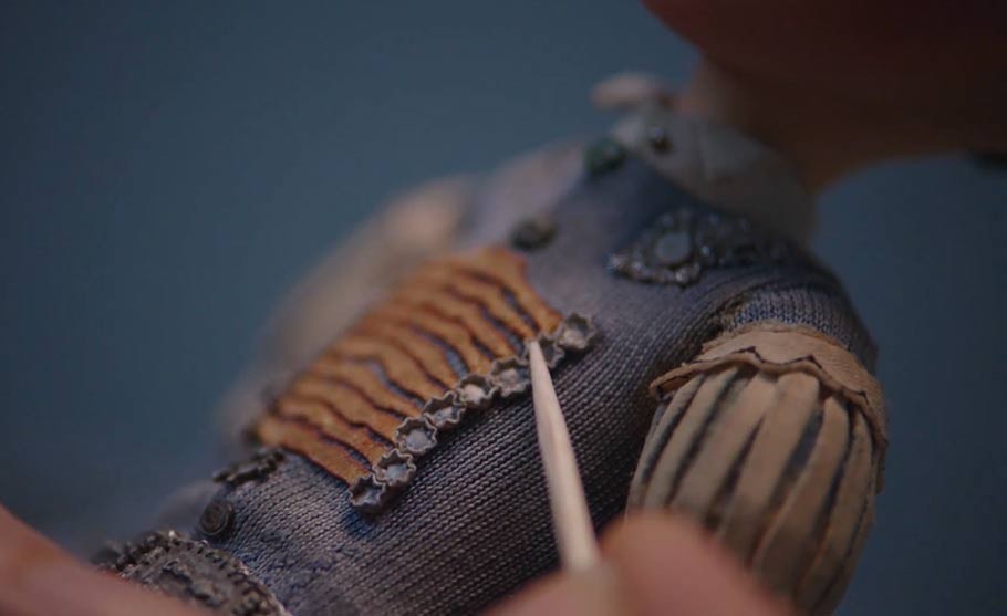 “We wanted some authenticity to the era so we’ve used some velvets and chiffons and things, but we back them in something [else],” Cook continues. “We use the properties of two fabrics.” As an example, she refers to a puppet of the film’s protagonist Eggs. “[His] pants have got a non-stretch suiting on the top, but it’s backed with Lycra.”