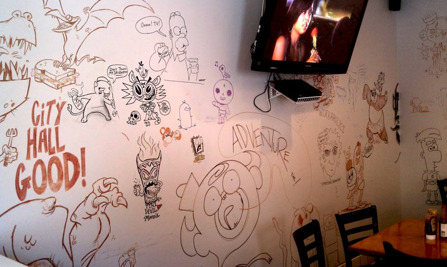When animators in Burbank get hungry, there’s Moore’s Deli, which has a back room decorated by animation artists, many from the nearby constellation of feature and TV animation studios. Owner Robert Moore, a former executive chef at Dodger Stadium, began allowing artists to draw on the walls a few years ago, and now these impromptu murals are an integral part of the room’s atmosphere. Characters from Futurama, Kung Fu Panda, Phineas and Ferb, Adventure Time, and, of course, Spongebob, bring life to what would otherwise be a pretty banal space. Some characters are just sketched, others carefully detailed; Moore keeps Sharpies on hand for when inspiration strikes his patrons. You don’t usually go to a deli for the art, but this is an exception.