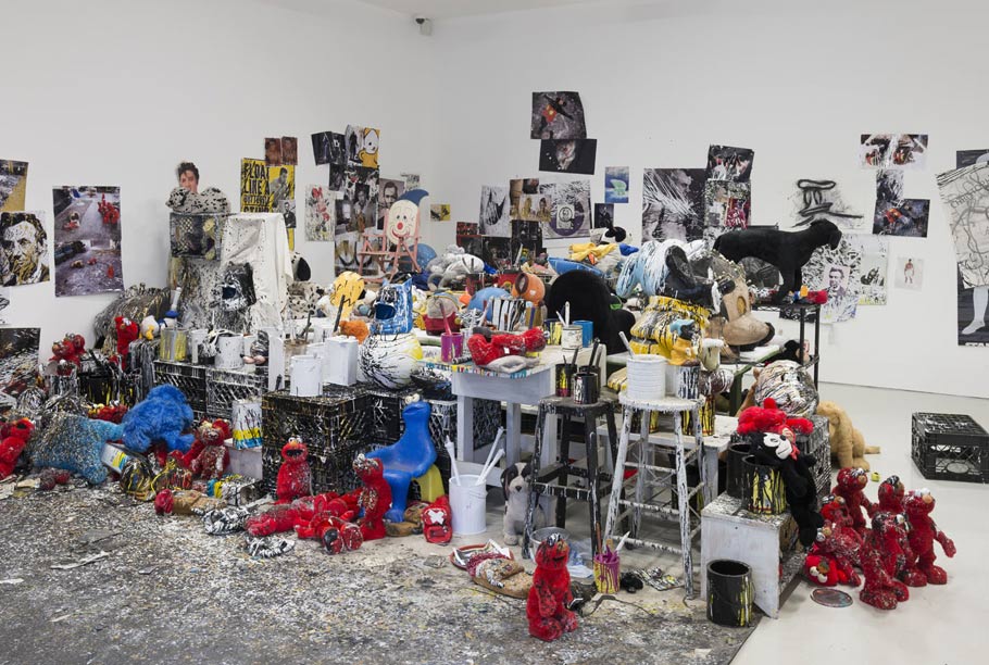 Pensato’s work, which is in the collection of the Musem of Modern Art, has received extensive recognition in the art world including the Guggenheim Fellowship (1996), the Pollock-Krasner Foundation Award (1997), and the Robert de Niro, Sr. Prize (2013). Her first museum survey, cheekily entitled “I Killed Kenny” (yet another animation reference), debuted last year at the Santa Monica Museum of Art, and ended its second run this month at the Contemporary Art Museum St. Louis. Given the chance to take on the white box that is the classic form of a contemporary art gallery, she brings chaos to it, a chaos she controls. That chaos is well represented in “Joyceland,” currently at London’s Lisson Gallery, where she has recreated her studio’s messy glory. In one room paint-spattered toys, furniture and studio equipment cover the floor, while photographs for inspiration are tacked on the walls. Much of the gallery is more traditional, cold white space with works hanging or painted directly on the walls. Homer Simpson gazes blankly outward; Batman’s mask fills one wall.