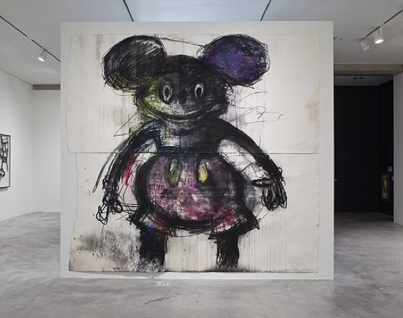 Pensato’s cartoon icons become doubly iconic—images of images, removed another step from their origin in a way that Andy Warhol might have approved of. Pensato’s mice and ducks are not mere copies though, but rather, her own expression, both innocent and disturbingly sinister, more subtly deviant than any deviantART image. Likenesses vary; in one work Mickey Mouse might be potrayed in a childlike fashion, and in another resemble the creepy monkey-in-a-mouse-suit from Babes in Toyland (1934). She works over her charcoal until the changes show as ghostly palimpsests; drips of enamel form scrims down her paintings.