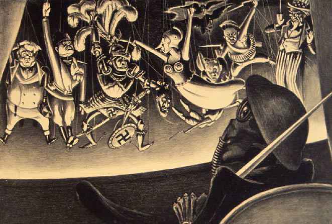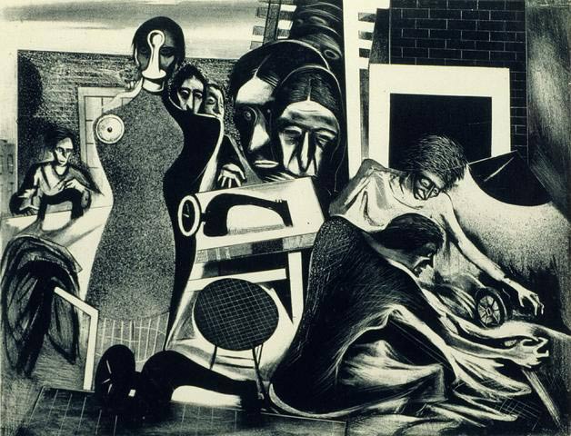 Politically-conscious graphic art has a long history, from Daumier up to Lynd Ward and Eric Drooker. The 1930s and ’40s were a rich period in this respect, as the rise of Communism and Fascism coupled with the Great Depression brought issues of social justice to the fore. The John Reed Club, an organization founded by staff members of the Communist magazine New Masses, formed in 1929 to support leftist artists and writers. It allied with the American Communist Party, and spread to thirty chapters nationwide before it was replaced in 1936 by the American Artists’ Congress, which survived until the Second World War.