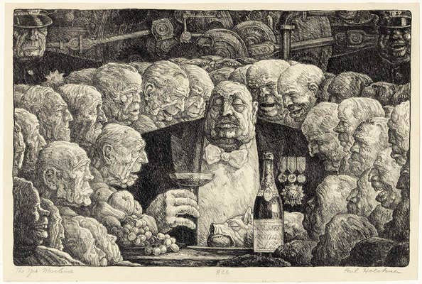 The Mary and Leigh Block Museum of Art, at Northwestern University in Evanston, Illinois, has mounted “The Left Front: Radical Art in the ‘Red Decade,’ 1929–1940,” an exhibition of artists who showed with the John Reed Club and the American Artists’ Congress. Drawn from the Block’s collection and elsewhere, the show naturally features artists from the Midwest, among more famous names. Some of the lesser-known works holds their own: Mabel Dwight’s “Danse Macabre” (1933-34, above) with its vaudeville show of political caricatures, and Carl Hoeckner’s “The Yes Machine” (1935, below), a scathing look at the capitalist fat cat. Among the famous fine artists included are Rockwell Kent, Stuart Davis, and Raphael Soyer. Diego Rivera, who made such a bad impression on Club members when he addressed them in 1932 that they repudiated him, is represented by his 1934 book, “Portrait of America.”
