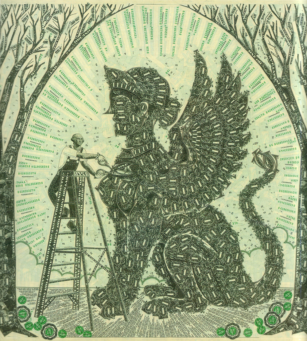 Wagner, a collage artist, has been busy cutting up thousands of U.S. one dollar bills and reshuffling the pieces into fantastic works of art.  The meticulousness of these collages is awe-inspiring.  Just one look and you can see what I am talking about. Here’s Riddle of the Sphinx: Click for a high resolution scan.