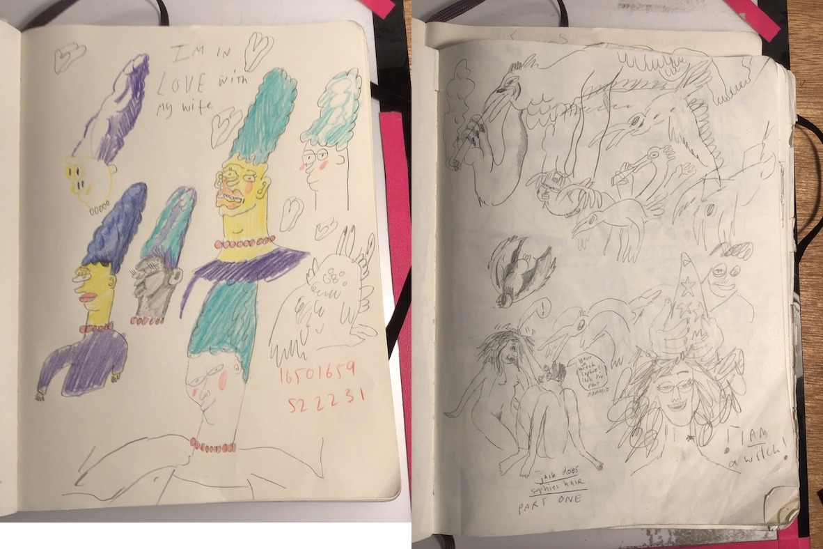 From there, it’s a 15-minute train journey to her studio in the eastern district of Shoreditch. On the way, we swing by Goldsmiths to see an exhibition of the Chicago Imagists; Gate is dismayed to find it closed. She discovered the group while on a trip to Chicago last year and was blown away. “Their work, especially Jim Nutt’s, looked like better versions of drawings I was trying to do at the time,” she explains. “Since then I have been inspired by their line work — controlled but completely mad, like surreal wobbly versions of Robert Crumb. I also like the fact that they exhibited together and helped each other out.”