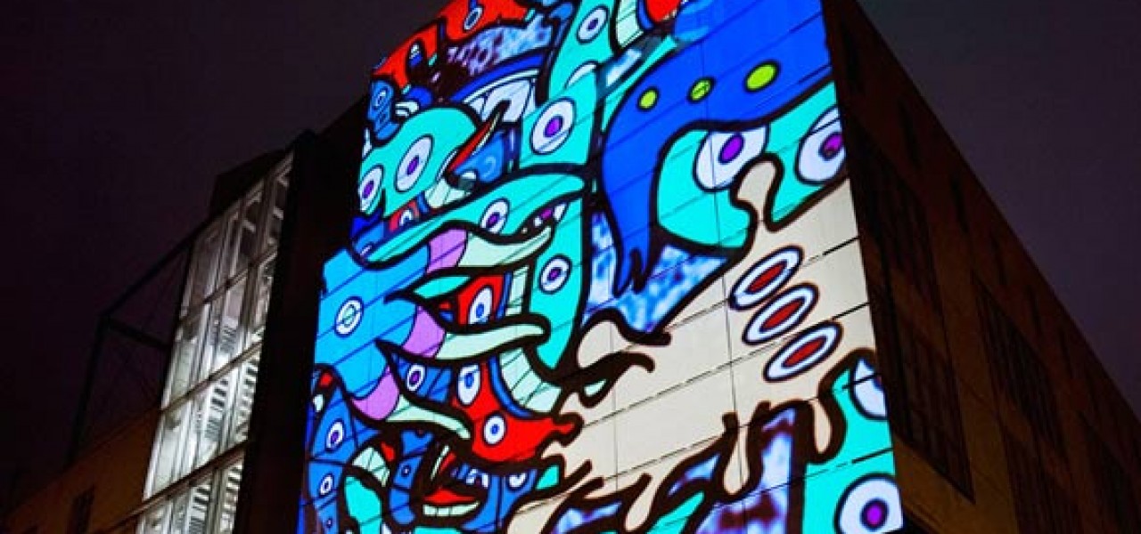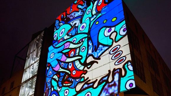 Animation is overtaking the streets of downtown Montreal’s entertainment district, the Quartier des Spectacles. In collaboration with the National Film Board of Canada, the city of Montreal is presenting McLaren Wall to Wall, seven original video artworks inspired by the films of legendary experimental animator Norman McLaren. These works, three of which are interactive, are projected onto the facades of buildings in the district. The display runs through the end of May, and is in celebration of McLaren’s centennial, which is tomorrow, April 11th. (1914 was a good year for animation, bringing into the world McLaren, John Hubley, Joy Batchelor, and Ward Kimball.)