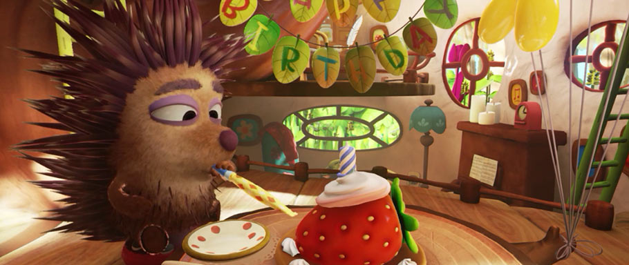 Oculus’ first short Lost, while an open-hearted homage to Brad Bird’s timeless 2D/CGI classic The Iron Giant, was also an object lesson in how to make, and not to make, a VR film. Its giant robotic hand, searching through a darkened forest in search of the rest of its body, was quite impressive, especially for fans of The Iron Giant, but it all still happened in front of the viewer, stuck within a frame that is more properly the domain of traditional cinema. Unseld and Oculus Story Studio technical director Max Planck, a 10-year veteran of Pixar, told Cartoon Brew they wanted Henry, directed by Brave and Cars 2 animator Ramiro Lopez Dau, to exist instead in a 360-degree sensorium, while still focusing on an endearing character who acknowledges and even waves at the viewer.