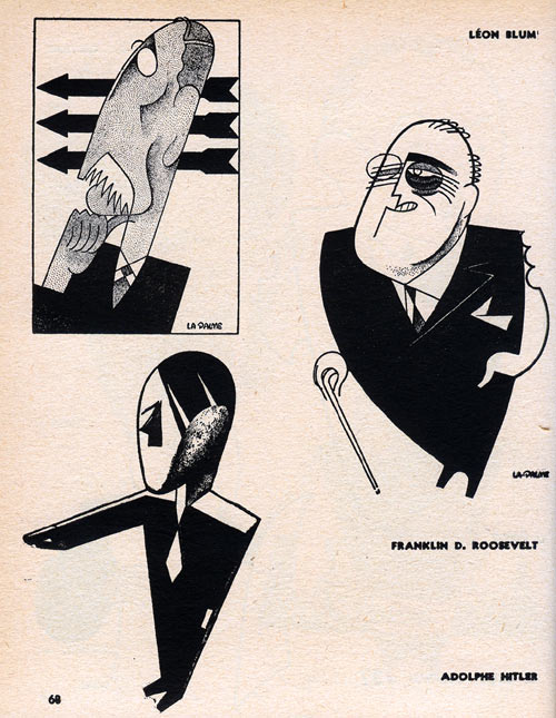 A couple cool cartoon finds to report from my recent sidetrip to Montreal. The first was my discovery of cartoonist La Palme. In one of Montreal’s many excellent used bookstores, I stumbled across a book from 1950 called LA PALME: THE FIRST 20 YEARS OF THE CANADIAN CARICATURIST. According to the bookseller, Robert La Palme is fairly well known in Canada (granted, as well as any cartoonist can be known) and this book is the only significant catalogue of his early work. In addition to being packed with caricatures, which are executed in a highly stylized Covarrubias/Garretto vein, the book also has examples of his painting, graphic design work, and political cartoons (the book says he drew over 2500 of them for the Montreal paper LA CANADA between 1943 and 1950). The political cartoons are also quite stylized, but here he employs a beautiful wavy bold brush line rather than the geometric abstractions of his caricatures. The book was published in a numbered edition of 5000 and I highly recommend searching it out to anybody interested in cartoons and caricature. There is an online obit about La Palme which says that he continued political cartooning until 1963 and that he was also the artistic director of Expo ’67: Montreal World’s Fair.