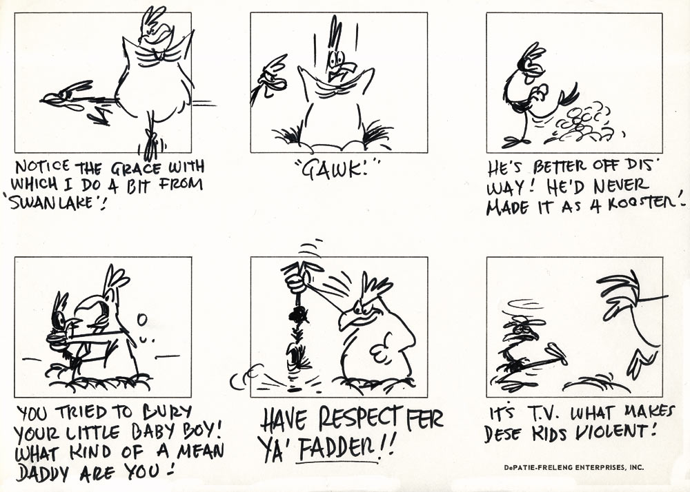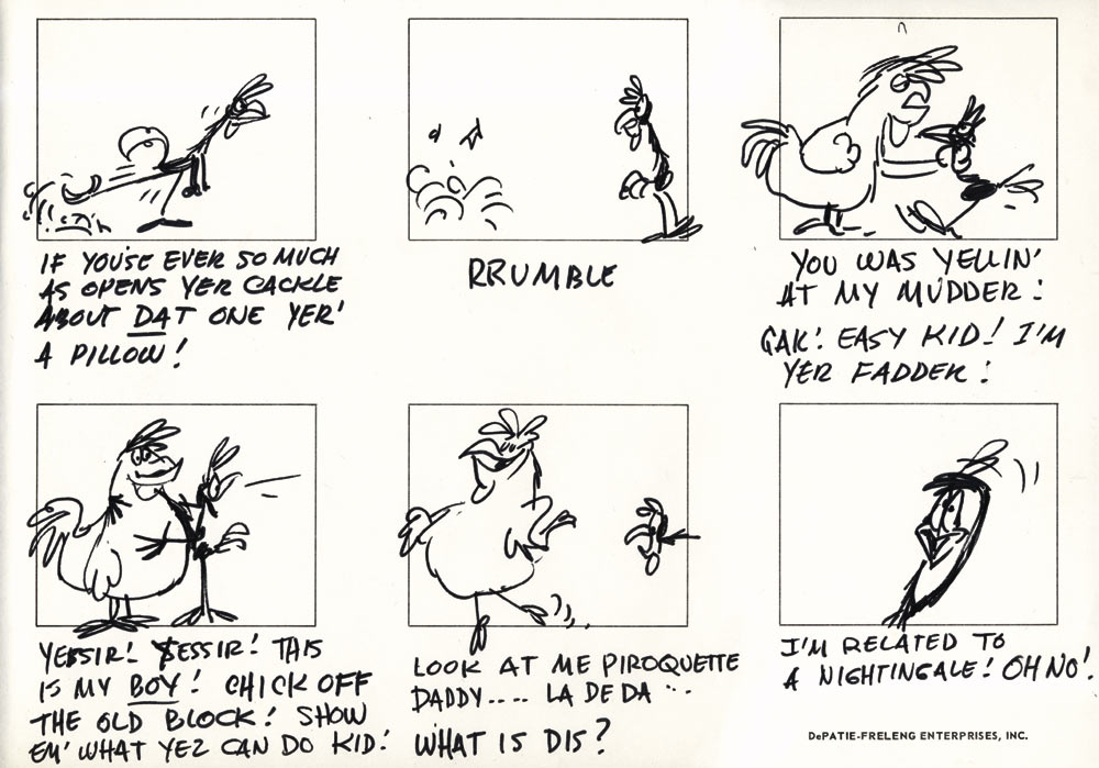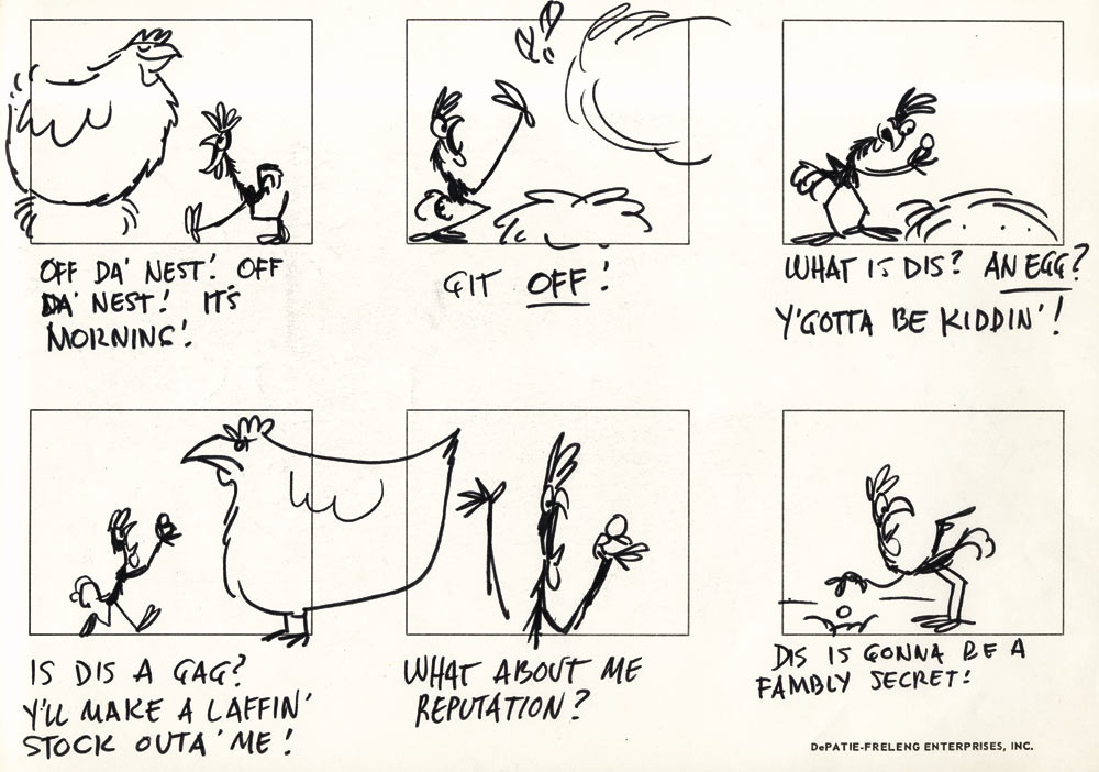 Here’s something I had to cut from the issue this week. It’s a DePatie-Freleng era thumbnail board by one of the issue’s featured artists, John Dunn (1920-1983). I have no idea whether it was for production (unlikely) or just a personal idea. I also don’t know if there’s more to the board; these three pages are all that exist at the moment. There’s a bitter undercurrent in a lot of Dunn’s humor, and it comes through rather strongly in these boards.