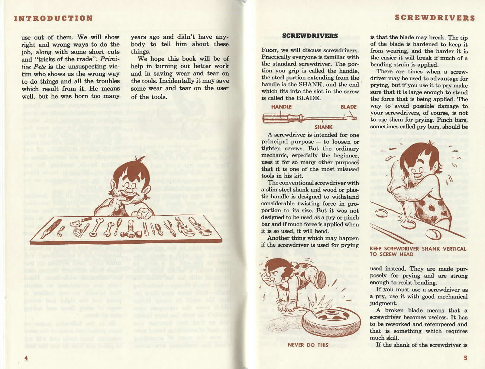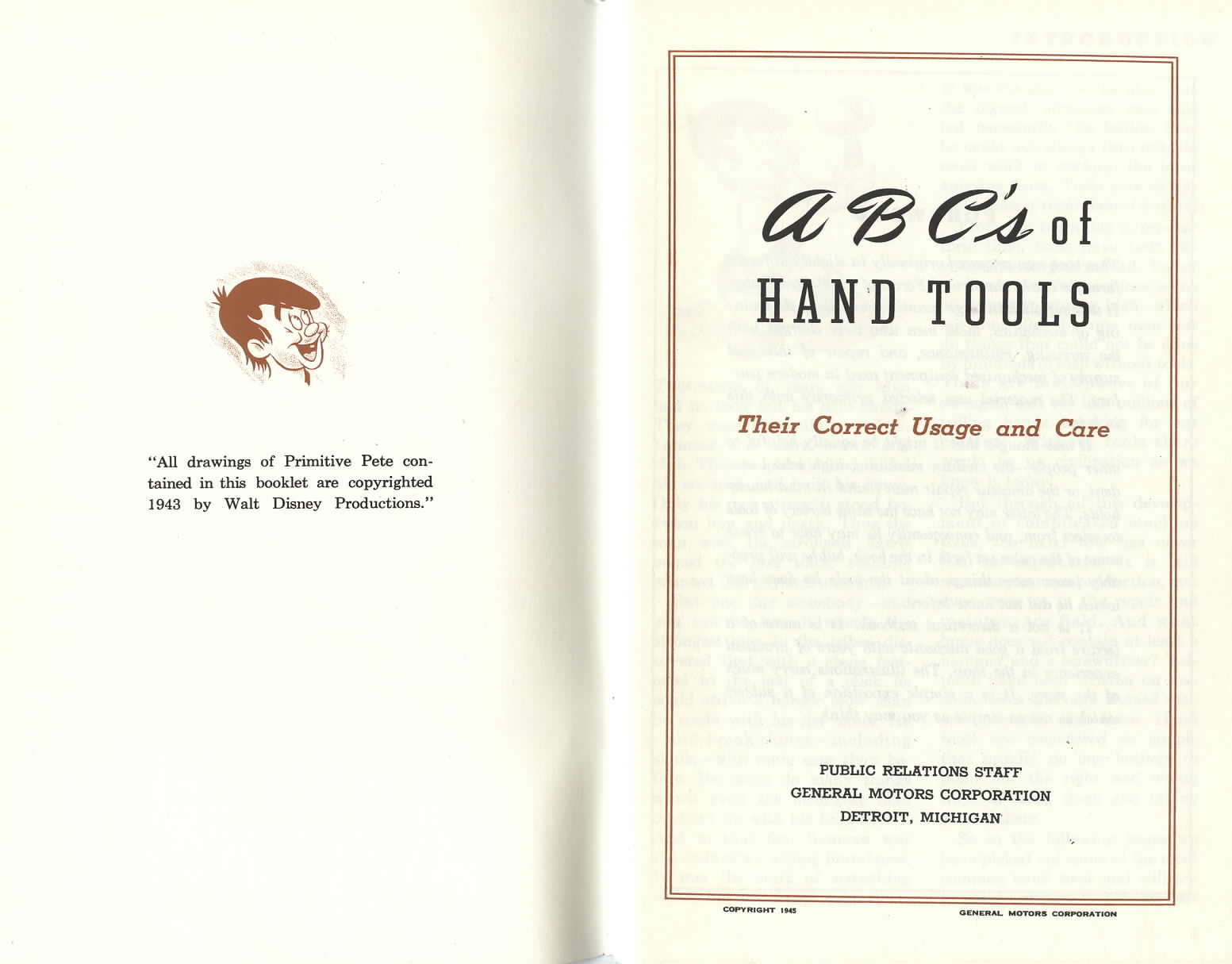 In 1946, long before it owned the ABC Television Network or created alphabet spelling books for children, Disney made an industrial film for General Motors called ABC’S of Hand Tools. Bill Roberts directed this educational short, aimed at adults, which demonstrates the proper use of common tools. The interesting thing is that the film (and accompanying booklet) re-uses the character “Emotion” (an uncouth caveman, and caricature of Ward Kimball, from the 1943 wartime cartoon Reason And Emotion – also directed by Roberts), here with a new name, “Primitive Pete”. Bob Sokol posted a pdf of the entire booklet here. J.J. Sedelmaier sent us large scans (below) of several pages of his copy.