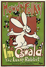 Brew correspondent B. Baker pointed out to me this morning this gorgeous 1927 OSWALD THE RABBIT poster being auctioned off by Heritage Galleries.I love cartoon movie posters – and I don’t think I’ve ever seen this particular color Disney-era stock one-sheet before. It looks to be introducing the character to theatre patrons, despite the fact that the white rabbit in the center is not the “lucky rabbit” we know – the real Oswald is running all over the sides. It’s also interesting to note Walter Lantz would go with a cuter “white rabbit” design in the later 1930s. Check it out at larger size here.