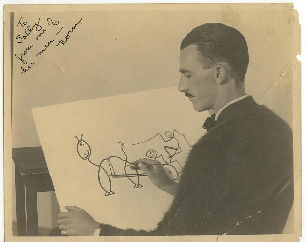 “To Sally, from one of her men – Norm”Norm who? Any ideas? Norm McCabe? Collector Gordon Reid found this still (click on it for larger image) and sent it to Leonard Maltin for identification. I took the liberty of posting it here, mainly because I love the cartoon he’s drawing (and his Mohair sweater – but I digress). If anyone knows who this is, we’d appreciate hearing from you.
