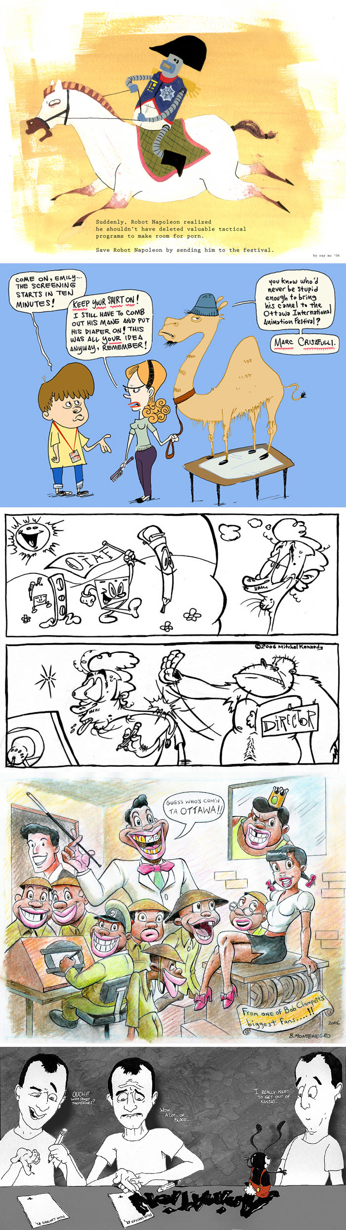 It wasn’t easy but Brewmasters Amid and Jerry have selected the two winners of our Ottawa International Animation Festival 2006 contest. They are Bill Robinson (East Aurora, NY) and Dav-Odd (NYC, NY). Each of these guys will receive a full Animapass (valued at $200Can) to next month’s festival. Their entries are below (click for larger versions). We chose Bill’s not only because it’s a fine tribute to Bob Clampett, who is the subject of a retrospective at Ottawa this year, but because of the extra effort he invested in the layout and typography to create a complete package. Dav-Odd’s piece should hit home for any animation lover: yes, a true animation fan can find things to admire even in a Chiquita banana commercial.