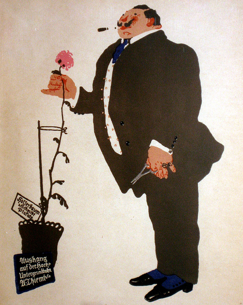 UPDATE – Brew reader Holger Pfläging offers a translation of the poster. He says: “The poster is advertising a company wich posts announcements and ads in the subways and elevated railways of I don’t know which German city. The upper card says: “Hollerbaum & Schmidt – Posters” the lower says: “Postings on elevated railway and subway – U. Thiemt & Co.” Thanks Holger!