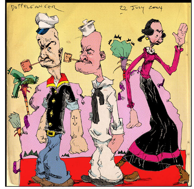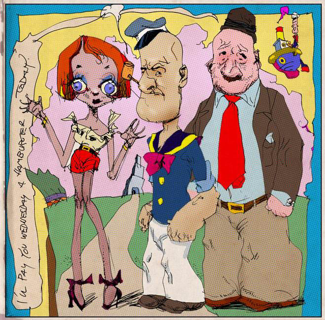 Less than a month ago I saw the two-reel Fleischer cartoon POPEYE THE SAILOR MEETS SINDBAD THE SAILOR (1936) for the first time. I didn’t think much of it upon this initial viewing, but now realize that may have had more to do with the faded, muddy public domain video copy I saw rather than the quality of the cartoon itself. That’s because a few nights ago I saw a restored 35mm print on the big screen of said cartoon and it was a radically different experience. The animation, the humor, the artwork, everything was pitch-perfect on this second viewing. The “3-D” sets, hardly distinguishable from the painted BGs on the videotape, were jaw-droppingly cool when seen on a grand scale, especially Sindbad’s cave, which radiated wicked fluorescent colors. This was the first public screening of the restored edition and hopefully it’ll receive many more screenings so audiences can enjoy this classic cartoon as it was meant to be seen. While on the subject of everybody’s preferred cartoon sailor, the prodigiously talented animation director Oscar Grillo has been emailing over some wild Popeye drawings during the past week and he’s agreed to let me share a few of them with Cartoon Brew readers. Click on each of the thumbnails for the larger version and enjoy!