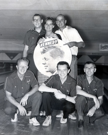Following up on Fred Crippen’s commercial for the Kennedy campaign which I mentioned a couple days ago, here’s a cool photo of Fred and friends at the bowling alley, presumably from election night 1960. Clockwise from top left: Pantomime sales rep Dick Reed, secretary (Fred can’t remember her name), animator/Pantomime co-owner John Marshall (he’s a relative of WB animator Rod Scribner), animator Ed Friedman, Pantomime producer/voice actor Paul Shively and Fred Crippen. Click on the image for a larger version.