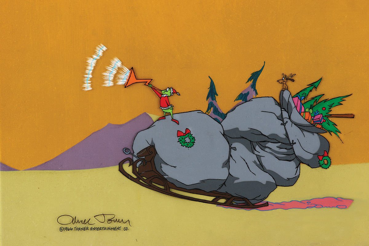 “GRINCH” AND “MAX” WITH SLEIGH PRODUCTION CELS ON MATCHING PRODUCTION BACKGROUND FROM HOW THE GRINCH STOLE CHRISTMAS! (MGM, 1966)