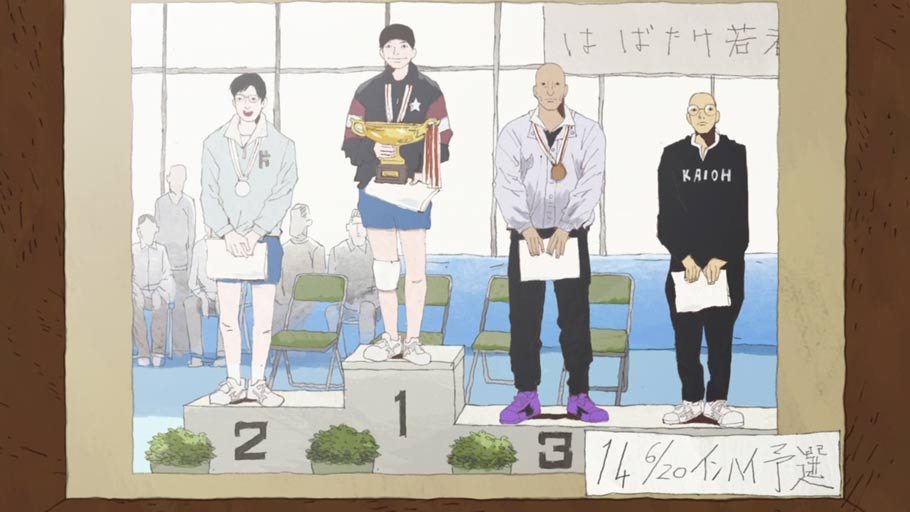 The episode rightly skips from the middle of the match to the coda many years later showing how the characters developed afterwards. The results are only indicated without fanfare when we zoom in on a victory photo showing Smile standing in first place, Peco in second and Ryuichi in third. The photo is dated June 20, 2014, the day after the actual broadcast, placing the action squarely in our time. The tweeting and SMSing at the beginning of the episode serve that purpose too.