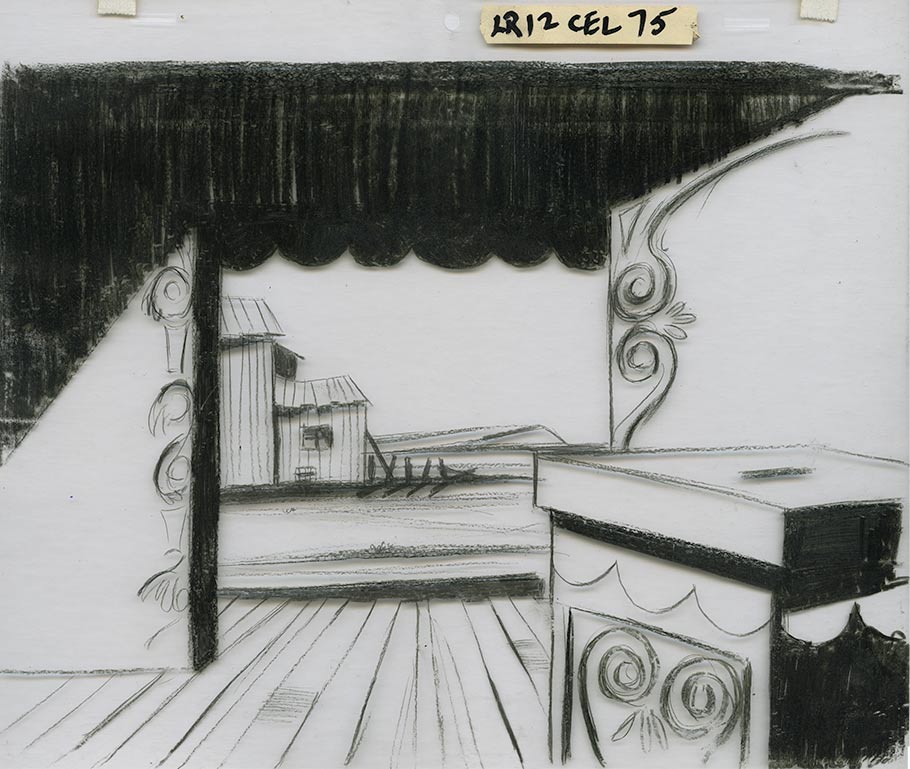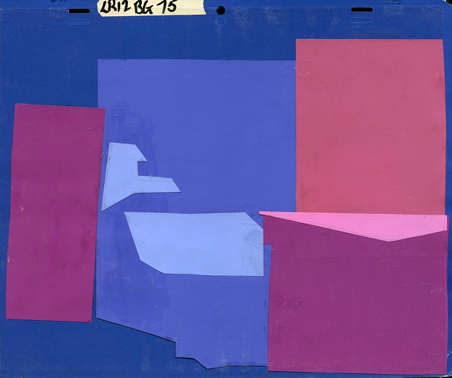 After being let go from the studio in the mid-Sixties, he started working in television on Format Film’s The Lone Ranger. On that show, he used a daring combination of grease pencil-on-cel with torn-construction paper underneath. Below, you can see a de-constructed background from the series that shows the grease pencil cel level and the separate color level underneath. “Powerful for Saturday morning, but you couldn’t say the backgrounds were Saturday morning crap because they weren’t,” Peregoy told interviewer Bob Miller.