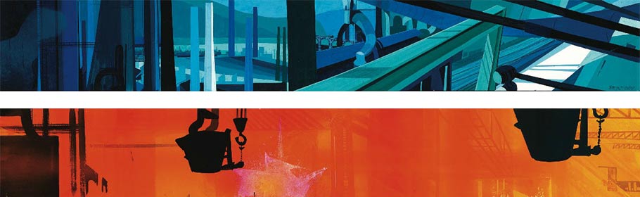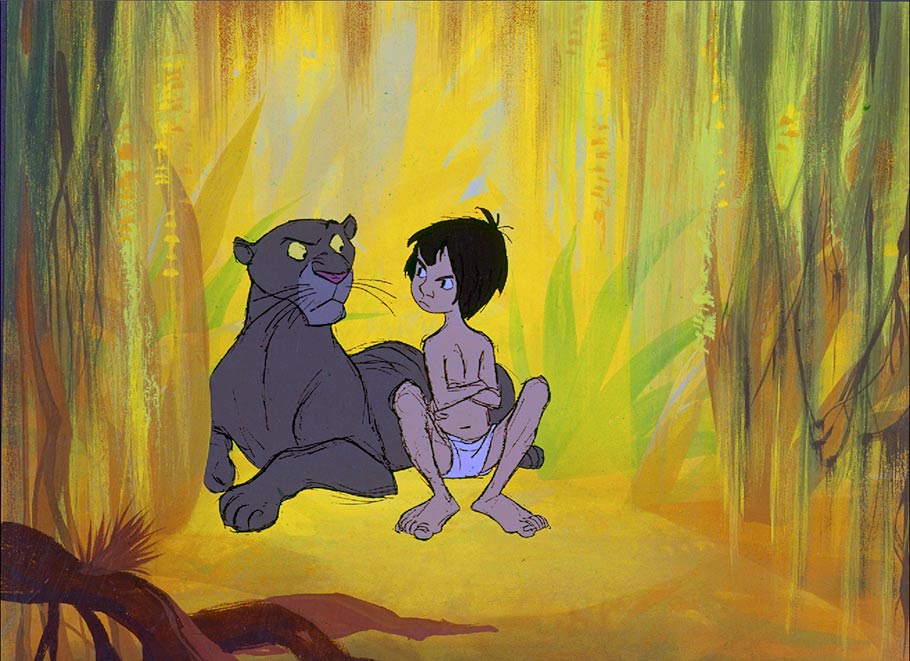 The studio’s next feature, One Hundred and One Dalmatians, was the project that allowed Peregoy to apply his fine art training on a Disney film. As the film’s color stylist, Peregoy worked closely with production designer Ken Anderson to devise a new way of painting backgrounds. With the background linework printed on a separate cel level (thanks to the innovation of the Xerography process) and overlaid on top of the painted artwork, Peregoy designed the paintings as broad flat areas of color “with the awareness that it was not necessary to go in and render the hell out of a doorknob, or a piece of glass, or a tree.”
