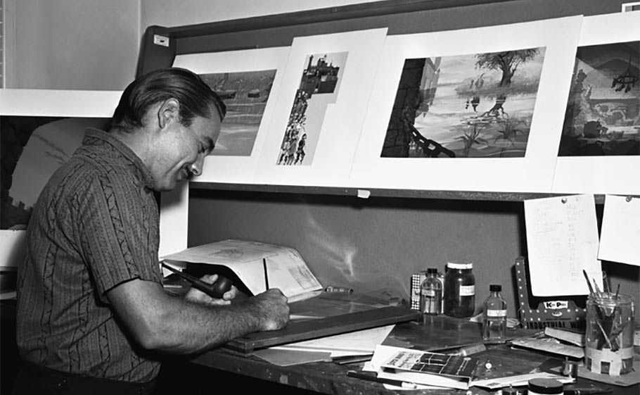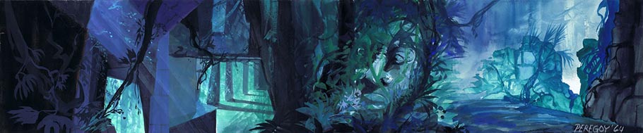 He was rehired at Disney in 1951 where “he started at the bottom again.” Peregoy worked for four years in the animation department as an inbetweener, assistant animator and clean-up artist, before production designer Eyvind Earle recruited him to become the first background painter on Sleeping Beauty in 1955.