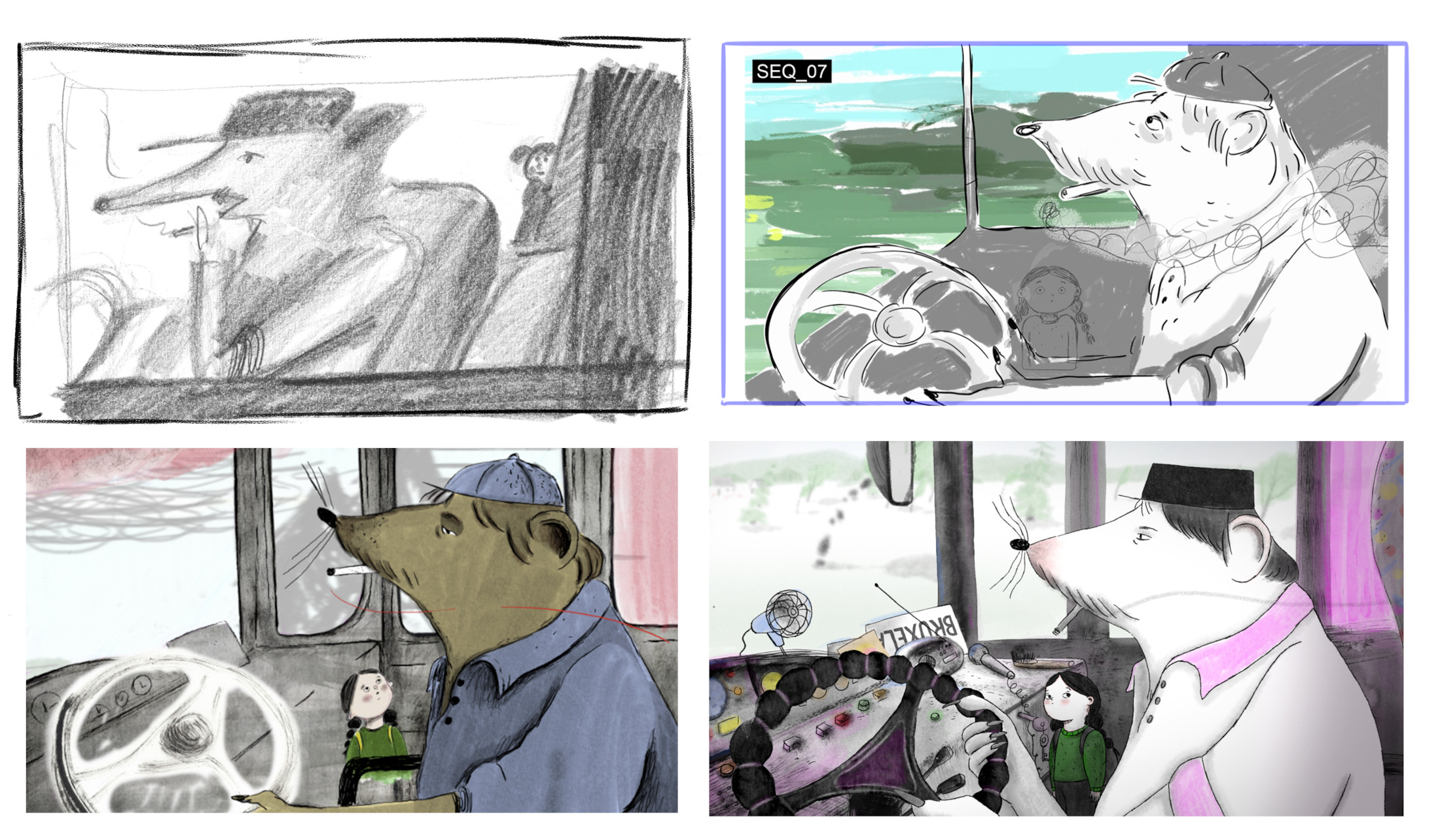 From a child’s perspective, everything feels exaggerated: details take on symbolic weight, proportions shift, and the bus itself transforms into a space that can feel creepy at times and endearing at others. Through the eyes of this little girl, migration becomes an initiatory journey — and animation offers the perfect medium to bring that vision to life. The color palette imposed itself on me: the gray of concrete contrasted with the flashy hues inspired by 1990s Poland, creating an aesthetic all its own. It was a vivid sensation of contrast that demanded to be expressed.