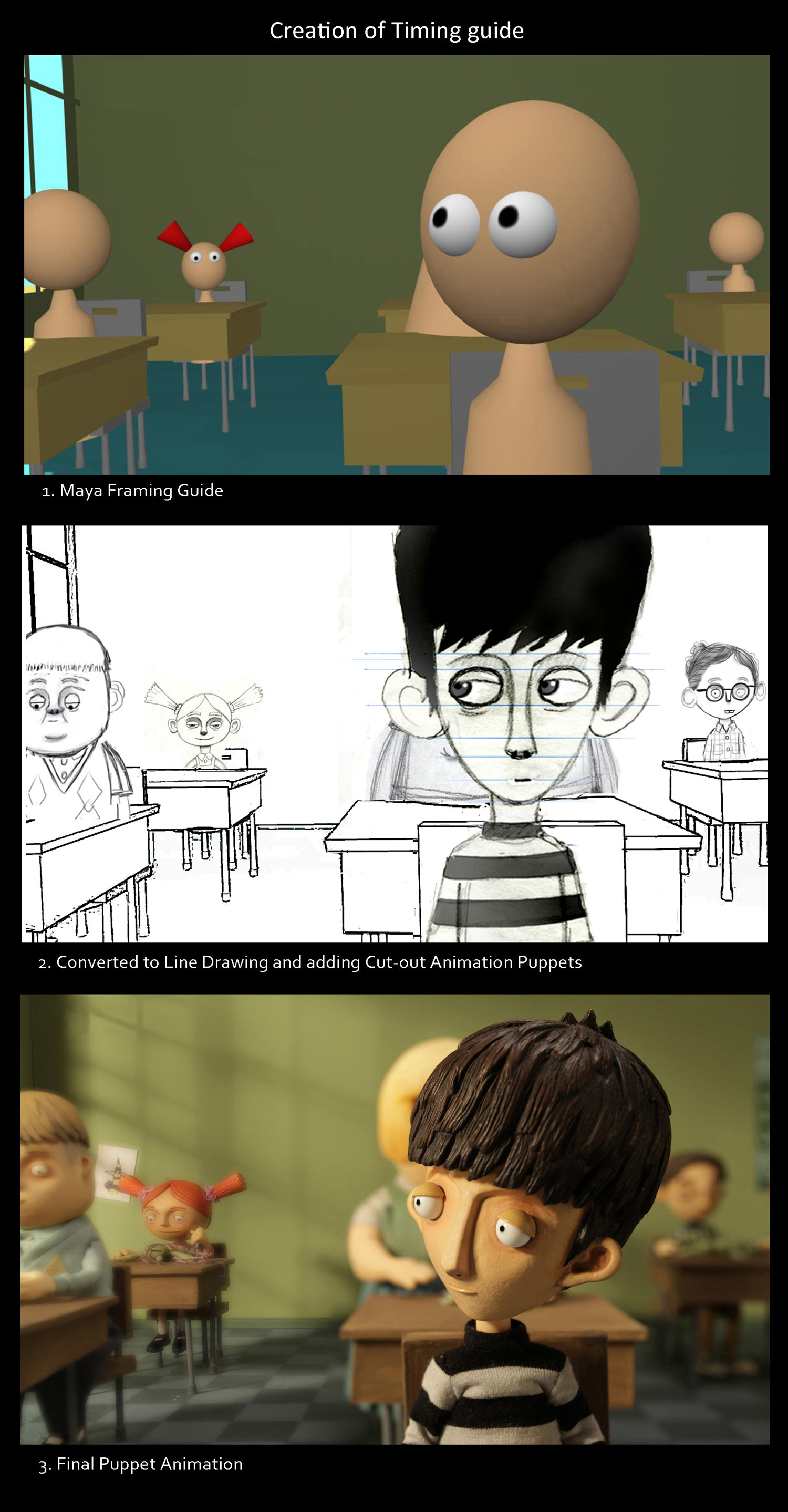 I went back to Maya and the world of CGI, but this time I only needed what I had already learned, which was just enough to build the exact classroom set, create non-animating primitives for placement of the kids and teacher and work out all my camera angles and field of view to know how many animating characters would be visible in each shot. That way I could avoid creating too much extra work for the animating crew.