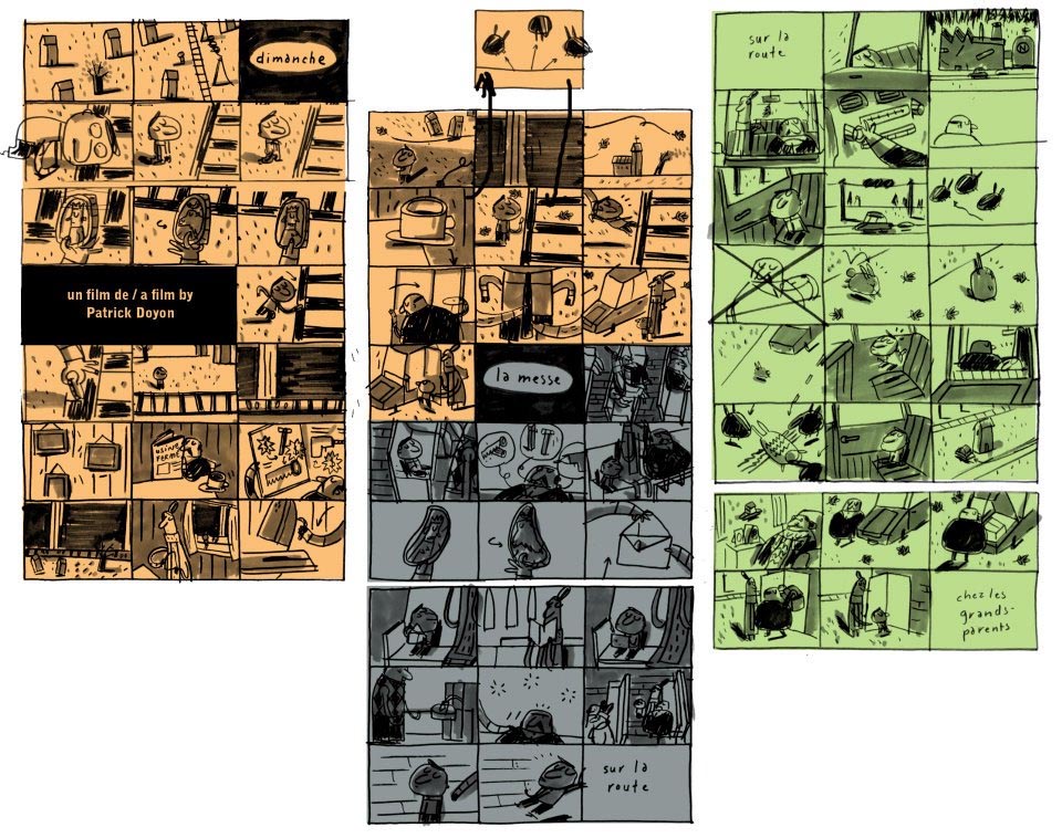 Doyon was introduced to the NFB in 2006 when he participated in their Hothouse program, which is an intense, twelve-week paid apprenticeship in which participants make short animated pieces. With that connection established, he worked on a proposal for Sunday. “I came up with the story first,” he says. “But the first storyboard was not the same design as the final. The design changed a lot in the process. It took me a long time to find a design for the little boy that I liked–and I could animate for two years. When I’m writing the story, it’s always through the drawings, more comic strip style, on very small pages.” (Click below to see a larger version of his storyboards.)