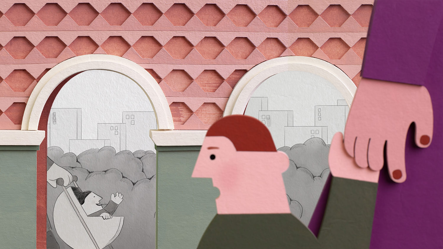 Cartoon Brew: How did you settle on hand-drawn, b&w animation for events happening in the past and the colorful paper cutouts used to show what’s happening in the present?