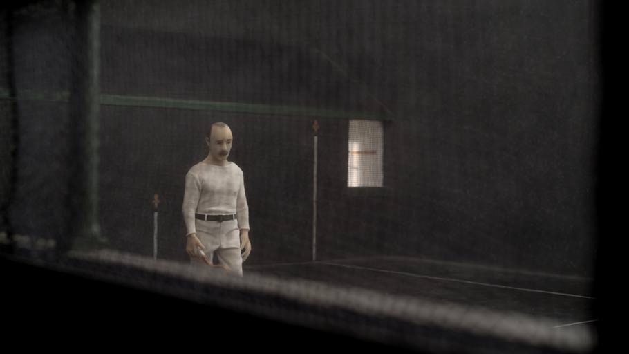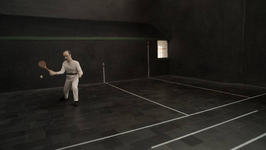 The set for the video is over fifteen-feet long, and represents the Fontainebleau tennis court as it stood over a century ago. The players are in period tennis costume. Mosley described to me how he achieved the complex camera work: “I performed the camera movements with a shoulder rig in an empty room with no subject in front of the camera. These camera movements were motion captured, then scaled down 13x to the size of the set. Finally, a DSLR camera was moved frame by frame in this hand-held camera trajectory by a motion control rig that I built. The puppet animation is straight forward stop motion.”