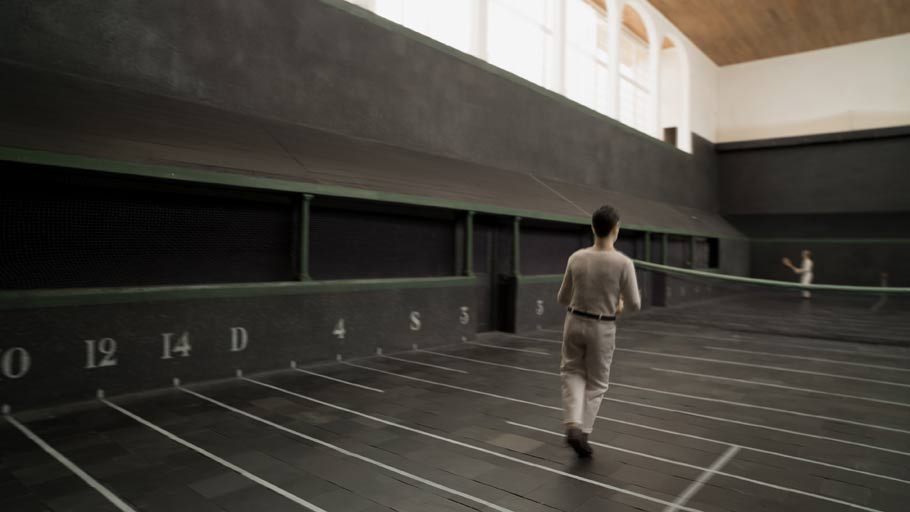 Jeu de Paume (the term means “palm game” and refers to a precursor to tennis) is not merely a video of a 1907 tennis game played in the court of the Chateau de Fontainebleau southeast of Paris. As described on Mosley’s website “…the video employs irregular editing rhythms, shots that stray from the central gameplay, and floating, dance-like camera movements that capture, along with the players’ action, the slanting angles of the architecture, the play of sunlight, and the visibility of the white ball against the dark court. Acknowledging that one’s concentration, both as player and spectator, ebbs and flows over the course of a match, the camera similarly responds to this idiosyncratic focus and the particularities of the environment to capture a shifting sense of human awareness.”