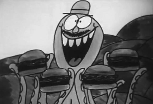 There’s something profoundly delightful about this early-Seventies Burger King ad featuring a mustachioed octopus selling Whoppers. It’s …